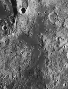 The northwestern part of this feature is located to the east-southeast of the crater Rocca, and is contained within the rim of the satellite crater Rocca A. The other part lies to the southeast of the first, and forms an elongated, irregular patch that extends generally in a north-south direction. The southern tip lies about one crater diameter to the northwest of the flooded crater Crüger. Crater counts of this feature yield an age of 3.50 Gyr for the basalt, placing its formation in the Imbrian era.[1]