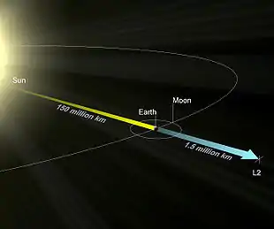 The L2 point lies on the line through the two large masses beyond the smaller of the two. Here, the combined gravitational forces of the two large masses balance the centrifugal force on a body at L2. On the opposite side of Earth from the Sun, the orbital period of an object would normally be greater than Earth's. The extra pull of Earth's gravity decreases the object's orbital period, and at the L2 point, that orbital period becomes equal to Earth's. Like L1, L2 is about 1.5 million kilometers or 0.01 au from Earth (away from the sun). An example of a spacecraft designed to operate near the Earth–Sun L2 is the James Webb Space Telescope.[8] Earlier examples include the Wilkinson Microwave Anisotropy Probe and its successor, Planck.