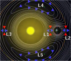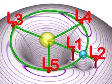 In celestial mechanics, the Lagrange points (/ləˈɡrɑːndʒ/; also Lagrangian points or libration points) are points of equilibrium for small-mass objects under the gravitational influence of two massive orbiting bodies. Mathematically, this involves the solution of the restricted three-body problem.[1]