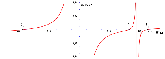 where r is the distance from the large body M1, R is the distance between the two main objects, and sgn(x) is the sign function of x. The terms in this function represent respectively: force from M1; force from M2; and centripetal force. The points L3, L1, L2 occur where the acceleration is zero — see chart at right. Positive acceleration is acceleration towards the right of the chart and negative acceleration is towards the left; that is why acceleration has opposite signs on opposite sides of the gravity wells.