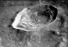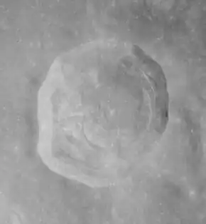Lalande is a small lunar impact crater that lies in the central part of the visible Moon, on the eastern edge of Mare Insularum. It was named after French astronomer Jérôme Lalande.[1] The crater is surrounded by a high-albedo area of ejecta that extends into a ray system with a maximum radius of over 300 kilometers. The interior wall has a terrace system, and there is a small central rise at the midpoint of the floor. It was formed during the Copernican period of the moon extending from 1.1 billion years ago to the present. Its young age is indicated by the bright rays of ejecta surrounding the crater, its sharp features, and the relative lack of later impacts in its interior.[2] The rays of ejecta from Lalande overlay the ejecta rays from Copernicus Crater, meaning it is younger than Copernicus, and thus no more than 800 million years old.[3]