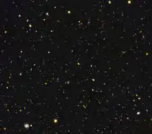 In astronomy, a deep field is an image of a portion of the sky taken with a very long exposure time, in order to detect and study faint objects. The depth of the field refers to the apparent magnitude or the flux of the faintest objects that can be detected in the image.[2] Deep field observations usually cover a small angular area on the sky, because of the large amounts of telescope time required to reach faint flux limits. Deep fields are used primarily to study galaxy evolution and the cosmic evolution of active galactic nuclei, and to detect faint objects at high redshift. Numerous ground-based and space-based observatories have taken deep-field observations at wavelengths spanning radio to X-rays.