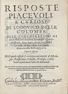Galileo, then a professor at the University of Padua, lectured on the supernova, proposing different possible ways it could have been produced. Galileo was cautious in his views, but did regard the phenomenon as new, and not as a permanent star.[8] A few months after delle Colombe's book appeared, a response to his ideas was published under the title of Considerations of Alimberto Mauri on Some Passages in the Discourse of Lodovico delle Colombe.[note 2] Alimberto Mauri was a pseudonym and delle Colombe (like most scholars since) believed that the author was Galileo. The book ridiculed many of delle Colombe's views about the star, and belittled him as 'nostro colombo' ('our pigeon').[10] It asserted that astronomy had no need of Aristotelian philosophy, and should focus on observation and mathematics. The approach of first seeing something in the sky and then developing an elaborate explanation to make that observation fit with Aristotelian cosmology was directly challenged.[11] Delle Colombe himself then responded to 'Mauri' by publishing Risposte piacevoli e curiose (Pleasant and curious replies) in 1608.[note 3][2] In this text delle Colombe not only attacked the ideas of Copernicus, but associated them with Galileo by name.[1]