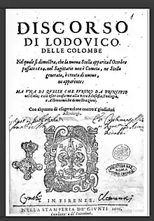 Delle Colombe is referred to as a living person in Castelli's 1615 book. After this date there are no known works by him and no literary or scientific references to him.[37] In 1623, Lodovico delle Colombe and his brother Corso were elected to the Consiglio dei Dugento.[38] Nothing is known of him after this date.