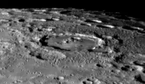 Magritte is a crater on Mercury, near the south pole. This crater was likely created by an impact event, as evident by its circular depression.[1] Its name was adopted by the International Astronomical Union in 2012, after the Belgian painter, René Magritte.[2] Magritte is one of several craters on Mercury named after famous artists. Per the Working Group for Planetary System Nomenclature, all Mercury craters are named after an artist who was famous for more than fifty years who has been deceased for more than three years at the time the crater is named.[3]
