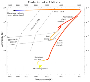 When a main-sequence star has consumed the hydrogen at its core, the loss of energy generation causes its gravitational collapse to resume and the star evolves off the main sequence. The path which the star follows across the HR diagram is called an evolutionary track.[57]