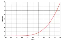 For a star with at least 0.5 M, when the hydrogen supply in its core is exhausted and it expands to become a red giant, it can start to fuse helium atoms to form carbon. The energy output of the helium fusion process per unit mass is only about a tenth the energy output of the hydrogen process, and the luminosity of the star increases.[48] This results in a much shorter length of time in this stage compared to the main-sequence lifetime. (For example, the Sun is predicted to spend 130 million years burning helium, compared to about 12 billion years burning hydrogen.)[49] Thus, about 90% of the observed stars above 0.5 M will be on the main sequence.[50] On average, main-sequence stars are known to follow an empirical mass–luminosity relationship.[51] The luminosity (L) of the star is roughly proportional to the total mass (M) as the following power law: