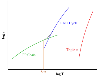 Logarithm of the relative energy output (ε) of proton–proton (PP), CNO and triple-α fusion processes at different temperatures (T). The dashed line shows the combined energy generation of the PP and CNO processes within a star. At the Sun's core temperature, the PP process is more efficient.