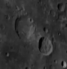 Malyy is a damaged lunar impact crater that lies on the far side of the Moon, behind the eastern limb as seen from the Earth. It is located to the south-southeast of the crater Artamonov. Slightly farther to the east-northeast lies Deutsch. The quadrant of terrain to the southwest of Malyy forms a nearly level plain marked by small craters and buried features.
