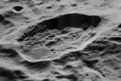 Mariotte is an elongated crater that is located on the far side of the Moon, named after the physicist Edme Mariotte.[1] This formation is located about one crater diameter to the southwest of the smaller Das. This crater is longer to the southeast by about an extra 5 km, giving this feature an egg-shaped outline. The outer rim is sharp-edged and little eroded. The interior floor is uneven, particularly toward the southeastern end. To the southeast of Mariotte is the large crater Chebyshev.