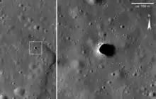The hole, first discovered by the Japanese SELenological and ENgineering Explorer (SELENE) and then later imaged by the Lunar Reconnaissance Orbiter[7] has been the subject of much research and speculation. There is a possibility that this feature could be a skylight in a lava tube.[8] The depth of this hole is estimated to be between 80 and 88 m (262 and 289 ft) and its width is estimated to be several hundreds of meters.[9] Additional radar echo patterns suggesting intact lava tubes have been found at several other locations around the Marius Hills, which correspond to areas of mass deficit in the GRAIL data.[10]