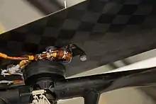 A small piece of the wing covering from the Wright brothers' 1903 Wright Flyer is attached to a cable underneath Ingenuity's solar panel.[111]