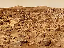 Finding an adequate landing site means being able to estimate rock size from orbit. The technology to accurately determine rock size under 0.5 meters in diameter from orbit has not yet been developed, so instead rock size distribution is inferred from its relationship to thermal inertia, based on thermal response of the landing site measured by satellites currently orbiting Mars. The Mars Reconnaissance Orbiter also helps this cause in the sense that its cameras can see rocks larger than 0.5 m in diameter.[14] Along with the possibility of the lander tipping over on sloped surfaces, large topographical features like hills, mesas, craters and trenches pose the problem of interference with ground sensors. Radar and Doppler radar can falsely measure altitude during descent and the algorithms that target the touchdown point of the lander can be "tricked" into releasing the lander too early or late if the craft passes over mesas or trenches while descending.[14]