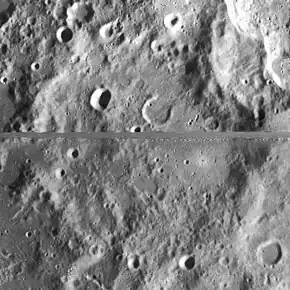 This is an old crater formation with an outer rim that has been heavily eroded by subsequent impacts, leaving an irregular impression of the crater rim. The inner wall is notched an indented by multiple small craters, with the most recent being Mee F along the northwestern side. Portions of the interior are relatively level, and there is a palimpsest, Mee E, in the northwestern part of the floor. A tiny crater with a high albedo halo is located in the eastern part of the floor.[3]