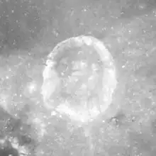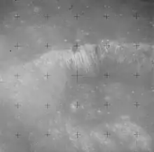 Menelaus (/ˌmɛnɪˈleɪəs/) is a young lunar impact crater located on the southern shore of Mare Serenitatis near the eastern end of the Montes Hæmus mountain range. Its diameter is 27 km.[1] To the southwest is the small crater Auwers, and to the west-southwest is the even smaller Daubrée. To the northeast is a faint rille system named the Rimae Menelaus.