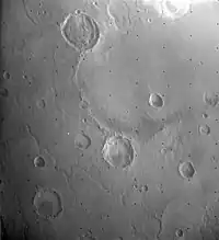 Miyamoto is a crater within the Margaritifer Sinus quadrangle (MC-19) region of the planet Mars, west of the Plains of Meridiani. It is 150 kilometers (93 mi) wide. Its northeastern half is filled with rocks formed in the presence of water and include minerals of iron and sulfur, which likely settled on lake bottoms or in groundwater systems. In the southwestern half of the crater floor, erosion has stripped these materials away, revealing clays and other materials like those found in the most ancient Martian rocks. More than 3.5 billion years old, they date to the Noachian era at which time, liquid water was likely present at the surface and could have created an environment favorable to life.[1]