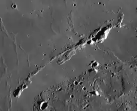 The selenographic coordinates of this range are 29.06°N 54.07°W. It continues for a distance of 160 kilometres. This range is a long, slender ridge formation that is more rugged at the northeastern end. There is also a rise at the southwest terminus of the range. The faint trace of a ray parallels the range just to the north. The 20 km gap between this range and the plateau to the south is covered by a flow of basaltic lava. There is a small wrinkle ridge near the northern part that is identified as Dorsum Niggli.