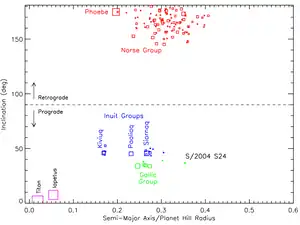 Three prograde moons of Saturn do not definitively belong to either the Inuit or Gallic groups.[1] S/2004 S 24 and S/2006 S 12 have similar orbital inclinations as the Gallic group, but have much more distant orbits with semi-major axes of ~400 Saturn radii and ~340 Saturn radii, respectively.[84][13][1] Whether S/2019 S 6 is in the Gallic group or Inuit group is disputed.[lower-alpha 5]