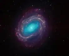 Messier 58 has a low-luminosity active galactic nucleus, where a starburst may be present[20] as well as a supermassive black hole with a mass of around 70 million solar masses.[21] It is also one of the very few galaxies known to possess a UCNR (ultra-compact nuclear ring), a series of star-forming regions located in a very small ring around the center of the galaxy.[22] This led to its being dubbed the "ring bearer galaxy" by the popular astronomy YouTube program "Deep Sky videos".[15]