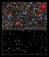 A 2008 study presented evidence for an intermediate-mass black hole at the center of Omega Centauri, based on observations made by the Hubble Space Telescope and Gemini Observatory on Cerro Pachón in Chile.[24][25] Hubble's Advanced Camera for Surveys showed that stars are bunching up near the center of Omega Centauri, as evidenced by the gradual increase in starlight near the center. Using instruments at the Gemini Observatory to measure the speed of stars swirling in the cluster's core, E. Noyola and colleagues found that stars closer to the core are moving faster than stars farther away. This measurement was interpreted to mean that unseen matter at the core is interacting gravitationally with nearby stars. By comparing these results with standard models, the astronomers concluded that the most likely cause was the gravitational pull of a dense, massive object such as a black hole. They calculated the object's mass at 40,000 solar masses.[24]