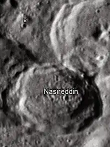 Nasireddin is a lunar impact crater that lies in the rugged terrain in the southern part of the Moon's near side. This crater overlaps two older formations, intruding into the crater Miller to the north and Huggins to the west. To the east of Nasireddin is the much larger walled plain Stöfler.
