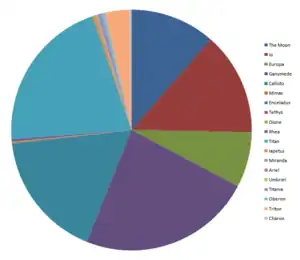 In the Solar System, there are six planetary satellite systems containing 288 known natural satellites altogether. Seven objects commonly considered dwarf planets by astronomers are also known to have natural satellites: Orcus, Pluto, Haumea, Quaoar, Makemake, Gonggong, and Eris.[1] As of January 2022, there are 447 other minor planets known to have natural satellites.[2]