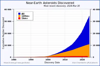 As of March 30, 2024 and according to statistics maintained by CNEOS, 34,725 NEOs have been discovered. Only 122 (0.35%) of them are comets, whilst 34,603 (99.65%) are asteroids. 2,406 of those NEOs are classified as potentially hazardous asteroids (PHAs).[1]