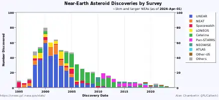 Several surveys have undertaken "Spaceguard" activities (an umbrella term), including Lincoln Near-Earth Asteroid Research (LINEAR), Spacewatch, Near-Earth Asteroid Tracking (NEAT), Lowell Observatory Near-Earth-Object Search (LONEOS), Catalina Sky Survey (CSS), Campo Imperatore Near-Earth Object Survey (CINEOS), Japanese Spaceguard Association, Asiago-DLR Asteroid Survey (ADAS) and Near-Earth Object WISE (NEOWISE). As a result, the ratio of the known and the estimated total number of near-Earth asteroids larger than 1 km in diameter rose from about 20% in 1998 to 65% in 2004,[7] 80% in 2006,[99] and 93% in 2011. The original Spaceguard goal has thus been met, only three years late.[8][100] As of March 2024, 861 NEAs larger than 1 km have been discovered.[1]
