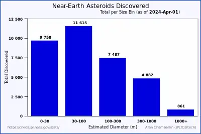 As of March 30, 2024, and using diameters mostly estimated crudely from a measured absolute magnitude and an assumed albedo, 861 NEAs listed by CNEOS, including 152 PHAs, measure at least 1 km in diameter, and 10,832 known NEAs, including 2,406 PHAs, are larger than 140 m in diameter.[1]