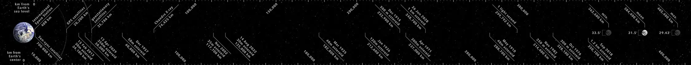 On November 8, 2011, asteroid (308635) 2005 YU55, relatively large at about 400 m (1,300 ft) in diameter, passed within 324,930 km (201,900 mi) (0.845 lunar distances) of Earth.[48]