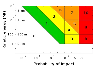 The simple Torino scale was established at an IAU workshop in Torino in June 1999, in the wake of the public confusion about the impact risk of 1997 XF11.[76] It rates the risks of impacts in the next 100 years according to impact energy and impact probability, using integer numbers between 0 and 10:[77][78]