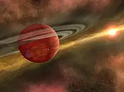 Once the cores are of sufficient mass (5–10 ME), they begin to gather gas from the surrounding disk.[2] Initially it is a slow process, increasing the core masses up to 30 ME in a few million years.[29][69] After that, the accretion rates increase dramatically and the remaining 90% of the mass is accumulated in approximately 10,000 years.[69] The accretion of gas stops when the supply from the disk is exhausted.[67] This happens gradually, due to the formation of a density gap in the protoplanetary disk and to disk dispersal.[34][72] In this model ice giants—Uranus and Neptune—are failed cores that began gas accretion too late, when almost all gas had already disappeared. The post-runaway-gas-accretion stage is characterized by migration of the newly formed giant planets and continued slow gas accretion.[72] Migration is caused by the interaction of the planet sitting in the gap with the remaining disk. It stops when the protoplanetary disk disappears or when the end of the disk is attained. The latter case corresponds to the so-called hot Jupiters, which are likely to have stopped their migration when they reached the inner hole in the protoplanetary disk.[72]