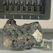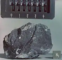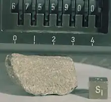 | 67556 | rake | - | breccia | A friable micropoikilitic impact melt with intrusive glass veins. It has a micrometeorite crater. |