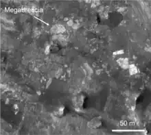 Megabreccia occurs throughout the basement unit of Northeast Syrtis. The composition of these megabreccias is complex, including altered or mafic material.[5] These megabreccias may be uplifted and exposed by the Isidis Basin forming event. The megabreccia could reveal the nature of the remnant of Mars's primary crust or the Noachian-aged low-calcium pyroxene lavas. It also could constrain the timing of Martian dynamo activity.