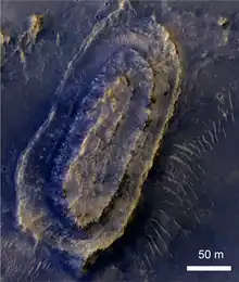 The mesa is one of the interesting locations. It consists of five subunits: crater-retaining cap, boulder-shedding slopes exposing lightened blocks, olivine-carbonate unit, Fe/Mg-phyllosilicate, allowing easy to access diverse rocks.[16][17]