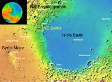 Northeast Syrtis is a region of Mars once considered by NASA as a landing site for the Mars 2020 rover mission.[1] This landing site failed in the competition with Jezero crater, another landing site dozens of kilometers away from Northeast Syrtis.[2] It is located in the northern hemisphere of Mars at coordinates 18°N,77°E in the northeastern part of the Syrtis Major volcanic province, within the ring structure of Isidis impact basin as well. This region contains diverse morphological features and minerals, indicating that water once flowed here.[3][4][5][6][7][8] It may be an ancient habitable environment; microbes could have developed and thrived here.
