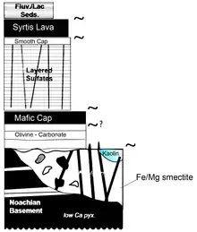 - Basement unit: The mixture of iron/magnesium (Fe/Mg) smectite and low-calcium pyroxene-bearing unit variably altered to Aluminium-clay bearing materials.[12]