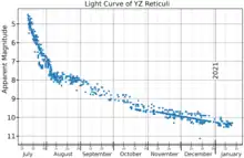 YZ Reticuli, also known as Nova Reticuli 2020 was a naked eye nova in the constellation Reticulum discovered on July 15, 2020. Previously it was known as a VY Sculptoris type object with the designation MGAB-V207.