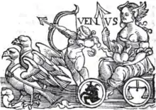 Because the movements of Venus appear to be discontinuous (it disappears due to its proximity to the sun, for many days at a time, and then reappears on the other horizon), some cultures did not immediately recognize Venus as single entity; instead, they assumed it to be two separate stars on each horizon: the morning star and the evening star. The Ancient Egyptians, for example, believed Venus to be two separate bodies and knew the morning star as Tioumoutiri and the evening star as Ouaiti.[4] The Ancient Greeks called the morning star Φωσφόρος, Phosphoros (Latinized Phosphorus), the "Bringer of Light" or Ἐωσφόρος, Eosphoros (Latinized Eosphorus), the "Bringer of Dawn". The evening star they called Hesperos (Latinized Hesperus) (Ἓσπερος, the "star of the evening").[5] By Hellenistic times, the ancient Greeks identified it as a single planet,[6][7] which they named after their goddess of love, Aphrodite (Αφροδίτη), Phoenician Astarte,[8] a planetary name that is retained in modern Greek.[9] Hesperos was translated into Latin as Vesper and Phosphoros as Lucifer ("Light Bearer").