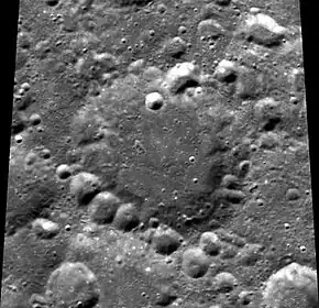 In comparison to the rim, the interior floor is nearly flat and smooth. The most notable impact is a small craterlet near the northern rim. There are a few tiny craterlets scattered about, but nothing of significance. The crater lacks a central peak, and the only irregularities lie along the edge of the inner wall.
