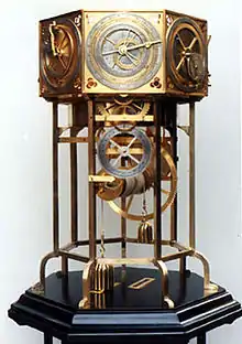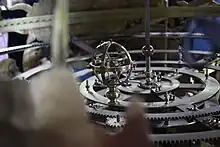 There is an orrery built by clock makers George Graham and Thomas Tompion dated c. 1710 in the History of Science Museum, Oxford.[13] Graham gave the first model, or its design, to the celebrated instrument maker John Rowley of London to make a copy for Prince Eugene of Savoy. Rowley was commissioned to make another copy for his patron Charles Boyle, 4th Earl of Orrery, from which the device took its name in English.[14][15] This model was presented to Charles' son John, later the 5th Earl of Cork and 5th Earl of Orrery. Independently, Christiaan Huygens published in 1703 details of a heliocentric planetary machine which he had built while living in Paris between 1665 and 1681. He calculated the gear trains needed to represent a year of 365.242 days, and used that to produce the cycles of the principal planets.[9]