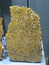 ![]() A slice of the Esquel pallasite, clearly showing the large olivine crystals suspended in the metal matrix. | |