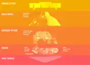 The Perseverance design evolved from its predecessor, the Curiosity rover. The two rovers share a similar body plan, landing system, cruise stage, and power system, but the design was improved in several ways for Perseverance. Engineers designed the rover wheels to be more robust than Curiosity's wheels, which had sustained some damage.[21] Perseverance has thicker, more durable aluminum wheels, with reduced width and a greater diameter, 52.5 cm (20.7 in), than Curiosity's 50 cm (20 in) wheels.[22][23] The aluminum wheels are covered with cleats for traction and curved titanium spokes for springy support.[24] The heat shield for the rover was made out of phenolic-impregnated carbon ablator (PICA), to allow it to withstand up to 2,400 °F (1,320 °C) of heat.[25] Like Curiosity, the rover includes a robotic arm, although Perseverance's arm is longer and stronger, measuring 2.1 m (6 ft 11 in). The arm hosts an elaborate rock-coring and sampling mechanism to store geologic samples from the Martian surface in sterile caching tubes.[26] There is also a secondary arm hidden below the rover that helps store the chalk-sized samples. This arm is known as the Sample Handling Assembly (SHA), and is responsible for moving the soil samples to various stations within the Adaptive Caching Assembly (ACA) on the underside of the rover. These stations include volume assessment (measuring the length of sample), imaging, seal dispensing, and hermetic seal station, among others.[27] Owing to the small space in which the SHA must operate, as well as load requirements during sealing activities, the Sample Caching System "is the most complicated, most sophisticated mechanism that we have ever built, tested and readied for spaceflight."[28]