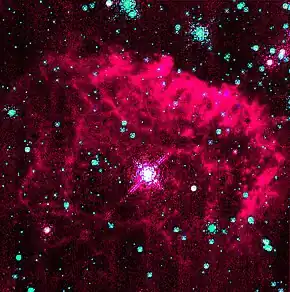 The Pistol Star was discovered using the Hubble Space Telescope in the early 1990s by Don Figer, an astronomer at UCLA. The star is thought to have ejected almost 10 solar masses of material in giant outbursts perhaps 4,000 to 6,000 years ago (as observed from Earth). Its stellar wind is over 10 billion times stronger than the Sun's. Its exact age and future are not known, but it is expected to end in a brilliant supernova or hypernova in 1 to 3 million years. The mass is equally uncertain, thought to have been up to 200 times the Sun when initially formed but now considerably less due to extreme mass loss although likely still over 100 times the Sun.[10] Modelling the star itself to match its spectrum gives a mass of 27.5 M☉,[7] while matching its current properties to an evolutionary model gives a much higher mass (86–92 M☉).[11] Earlier studies once claimed the Pistol Star as the most massive star known at around 250 M☉.[4]