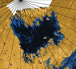 ![]() Punga Mare from a false-color mosaic of synthetic aperture radar images of Titan's north polar region. A northern extension of Kraken Mare enters the view at lower right. | |