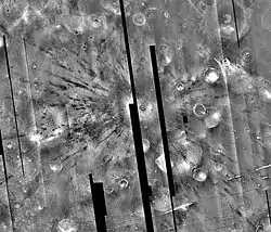 In planetary geology, a ray system comprises radial streaks of fine ejecta thrown out during the formation of an impact crater, looking somewhat like many thin spokes coming from the hub of a wheel. The rays may extend for lengths up to several times the diameter of their originating crater, and are often accompanied by small secondary craters formed by larger chunks of ejecta. Ray systems have been identified on the Moon, Earth (Kamil Crater), Mercury, and some moons of the outer planets. Originally it was thought that they existed only on planets or moons lacking an atmosphere, but more recently they have been identified on Mars in infrared images taken from orbit by 2001 Mars Odyssey's thermal imager.
