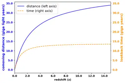 - Staff (2018). "UCLA Cosmological Calculator". UCLA. Retrieved 6 August 2022. Light travel distance was calculated from redshift value using the UCLA Cosmological Calculator, with parameters values as of 2018: H0=67.4 and OmegaM=0.315 (see Table/Planck2018 at "Lambda-CDM model#Parameters" )