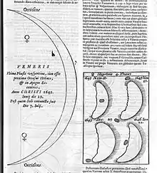 Riccioli and Grimaldi extensively studied the Moon, of which Grimaldi drew maps. This material was included in Book 4 of the New Almagest.[20] Grimaldi's maps were based on earlier work by Johannes Hevelius and Michael van Langren. On one of these maps, Riccioli provided names for lunar features—names that are the basis for the nomenclature of lunar features still in use today. For example, Mare Tranquillitatis (The Sea of Tranquility, site of the Apollo 11 landing in 1969), received its name from Riccioli. Riccioli named large lunar areas for weather. He named craters for significant astronomers, grouping them by philosophies and time periods.[21] Although Riccioli rejected the Copernican theory, he named a prominent lunar crater "Copernicus", and he named other important craters after other proponents of the Copernican theory such as Kepler, Galileo and Lansbergius. Because craters that he and Grimaldi named after themselves are in the same general vicinity as these, while craters named for some other Jesuit astronomers are in a different part of the Moon, near the very prominent crater named for Tycho Brahe, Riccioli's lunar nomenclature has at times been considered to be a tacit expression of sympathy for a Copernican theory that, as a Jesuit, he could not publicly support.[22] However, Riccioli said he put the Copernicans all in stormy waters (the Oceanus Procellarum).[23] Another noteworthy feature of the map is that Riccioli included on it a direct statement that the Moon is not inhabited. This ran counter to speculations about an inhabited Moon that had been present in the works of Nicholas of Cusa, Giordano Bruno, and even Kepler, and which would continue on in works of later writers such as Bernard de Fontenelle and William Herschel.[24][25]