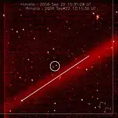 In September 2006, as NASA's New Horizons mission to Pluto approached Jupiter for a gravity assist, it photographed what appeared to be a faint, previously unknown planetary ring or ring arc, parallel with and slightly inside the orbit of the irregular satellite Himalia. The amount of material in the part of the ring or arc imaged by New Horizons was at least 0.04 km3, assuming it had the same albedo as Himalia. If the ring (arc) is debris from Himalia, it must have formed quite recently, given the century-scale precession of the Himalian orbit. It is possible that the ring could be debris from the impact of a very small undiscovered moon into Himalia, suggesting that Jupiter might continue to gain and lose small moons through collisions.[34]
