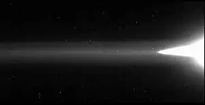 The existence of the Jovian rings was inferred from observations of the planetary radiation belts by Pioneer 11 spacecraft in 1975.[35] In 1979 the Voyager 1 spacecraft obtained a single overexposed image of the ring system.[1] More extensive imaging was conducted by Voyager 2 in the same year, which allowed rough determination of the ring's structure.[5] The superior quality of the images obtained by the Galileo orbiter between 1995 and 2003 greatly extended the existing knowledge about the Jovian rings.[2] Ground-based observation of the rings by the Keck[4] telescope in 1997 and 2002 and the HST in 1999[3] revealed the rich structure visible in back-scattered light. Images transmitted by the New Horizons spacecraft in February–March 2007[13] allowed observation of the fine structure in the main ring for the first time. In 2000, the Cassini spacecraft en route to Saturn conducted extensive observations of the Jovian ring system.[36] Future missions to the Jovian system will provide additional information about the rings.[37]